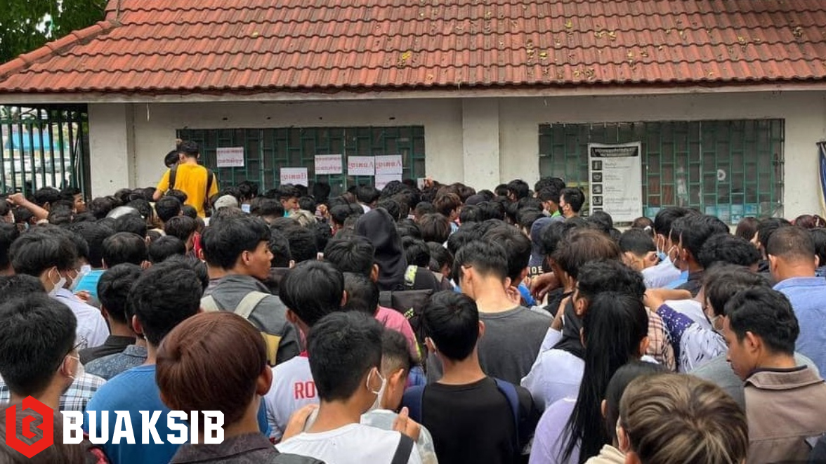กลุ่มแฟนบอลชาวกัมพูชา จำนวนมหาศาลแห่มารอหน้าห้องจำหน่ายตั๋ว สนามโอลิมปิก สเตเดี้ยม กรุงพนมเปญ เพื่อมารับตั๋วเข้าชมฟรี ในการแข่งขันฟุตบอลชาย ซีเกมส์ 2023 นัดเปิดสนาม กลุ่ม A ระหว่าง กัมพูชา – ติมอร์-เลสเต้ ในวันที่ 29 เม.ย. 2566