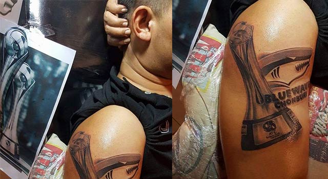 คนที่คุณก็รู้ว่าใคร เผย รอยสักสุดเท่ห์ รูปถ้วยแชมป์ฟุตซอลสโมสรเอเชีย ที่ พีทีที บลูเวฟ ชลบุรี เพิ่งคว้ามาได้ จากรูปรอยสักแล้วยังไม่ทราบว่าเป็นรอยสักของใคร