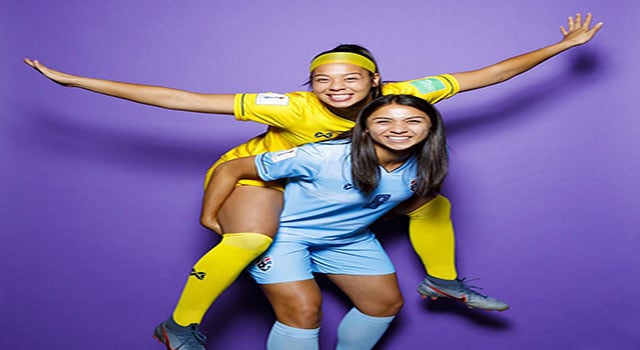 ฟุตบอลหญิงทีมชาติไทย ผู้เล่นจะสวมชุดสีฟ้า ผู้รักษาประตูชุดเหลือง บีบสีเหลือง