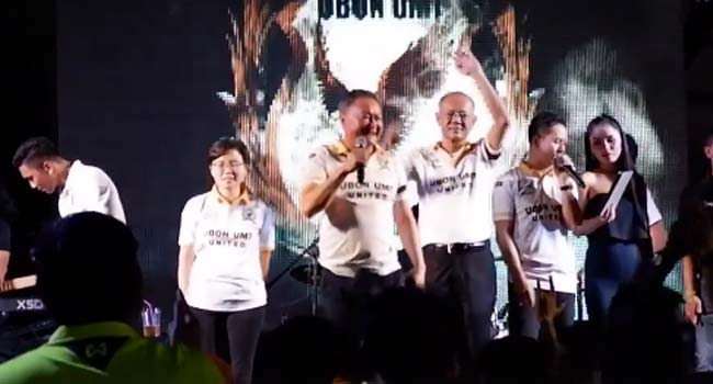 “บิ๊กอ้อย” ผศ.ดร.วีระศักดิ์ จินารัตน์ ประธานสโมสร อุบล ยูเอ็มที ยูไนเต็ด โชว์พลังลูกคอร้องเพลง ศรัทธา ของศิลปินวง หิน เหล็ก ไฟ บนเวทีการเลี้ยงฉลองปิดฤดูกาลที่ บริเวณหน้าสนาม ยูเอ็มที สเตเดี้ยม