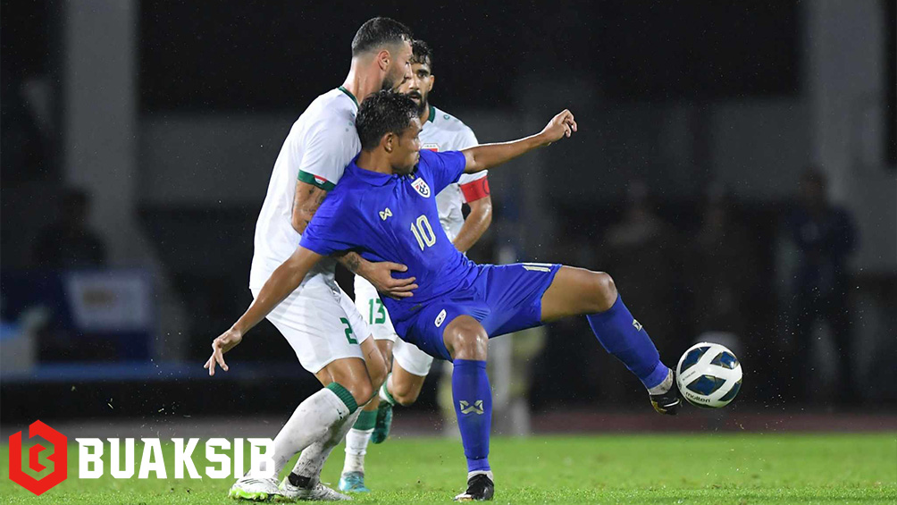 นาที 37 ธีราทร บุญมาทัน เปิดบอลให้ นิโคลัส มิคเกลสัน โขกให้ทีมชาติไทย ไล่อิรักมาเป็น 1-1 และจบครึ่งแรกไปด้วยสกอร์นี้