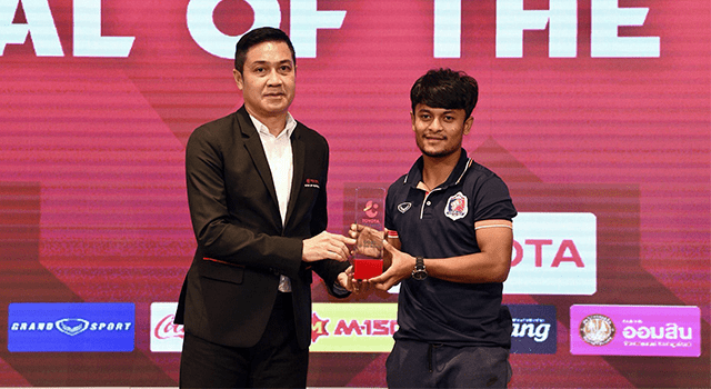 นาวาอากาศเอก ปิยพงษ์ ผิวอ่อน แบรนด์แอมบาสเดอร์ของ โตโยต้า ไทยลีก ได้มอบรางวัลประตูยอดเยี่ยมประจำเดือนกุมพาพันธ์ให้แก่ นูรูล ศรียานเก็ม ปีกความเร็วสูงของ การท่าเรือ เอฟซี