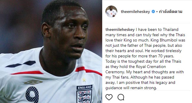 เอมิล เฮสกีย์ อดีตกองหน้าทีมชาติอังกฤษ โพสตส์อินสตาแกรมร่วมถวายอาลัยในโอกาสถวายพระเพลิงพระบรมศพ พระบาทสมเด็จพระปรมินทรมหาภูมิพลอดุลยเดช บรมนาถบพิตร