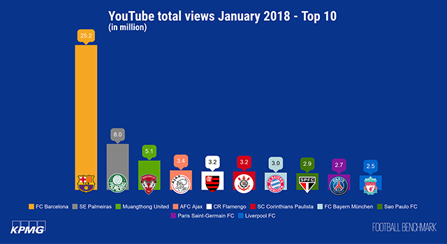 สำหรับ 10 อันดับสโมสร ที่มีผู้ชมติดตามดูคลิปใน YouTube มากที่สุด ประจำเดือนมกราคม 2018